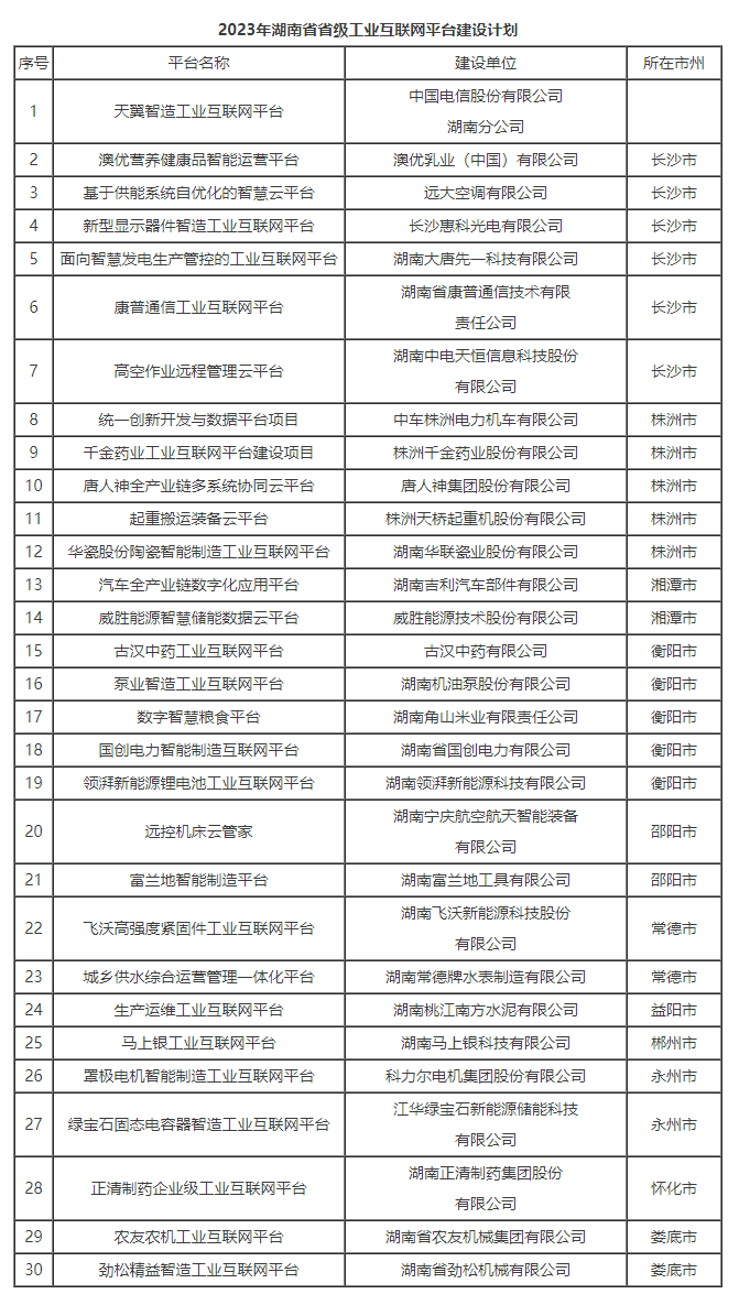 為深入開展“智賦萬企”行動,持續(xù)建設(shè)省級工業(yè)互聯(lián)網(wǎng)平臺體系,加快企業(yè)數(shù)字化轉(zhuǎn)型,打造國家重要先進(jìn)制造業(yè)高地,經(jīng)企業(yè)申報(bào)、市州推薦、現(xiàn)場答辯、專家評審等程序,省工信廳同意天翼智造工業(yè)互聯(lián)網(wǎng)平臺等30個(gè)項(xiàng)目列入2023年湖南省省級工業(yè)互聯(lián)網(wǎng)平臺建設(shè)計(jì)劃,現(xiàn)予發(fā)布。